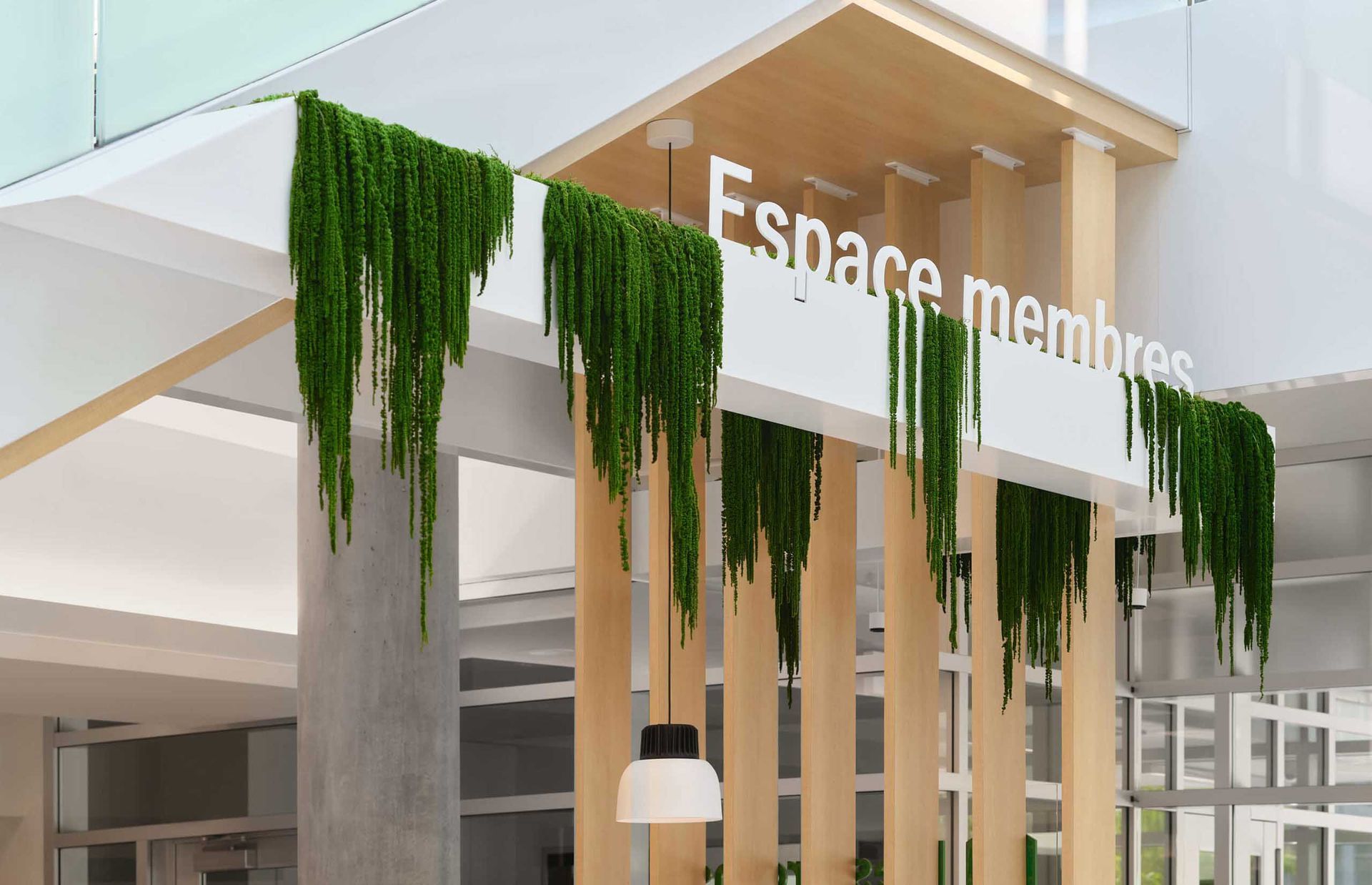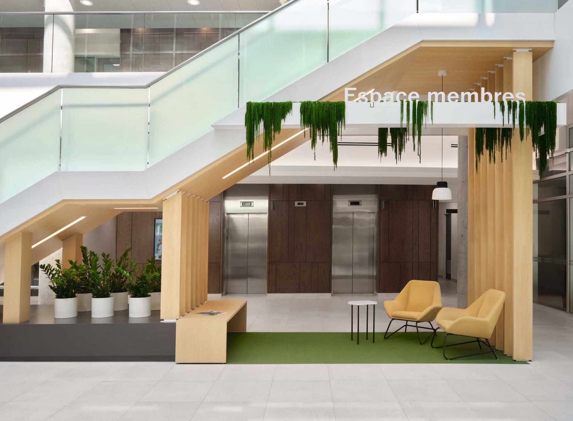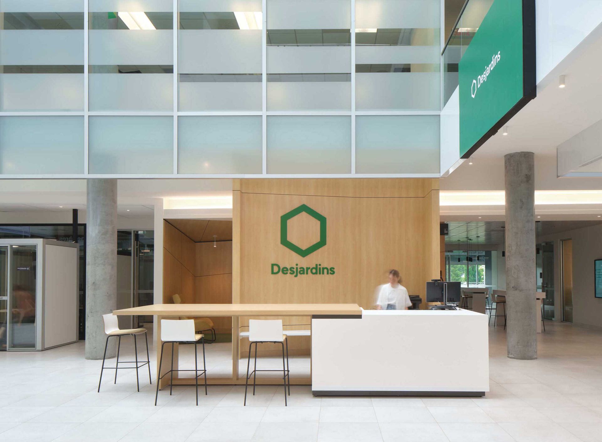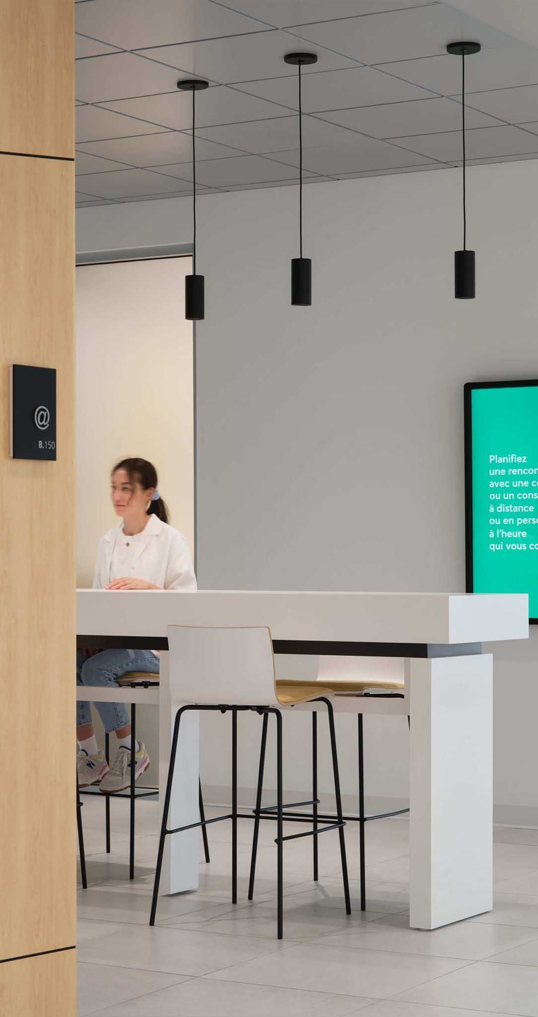 Integrating nature into the heart of the building. It was with this biophilic design approach in mind that the architects conceived the redevelopment of the ground floor of the Carrefour de la Coopération in Granby. The goal was to add a digital banking area to the space and make it more welcoming, functional, and user-friendly.