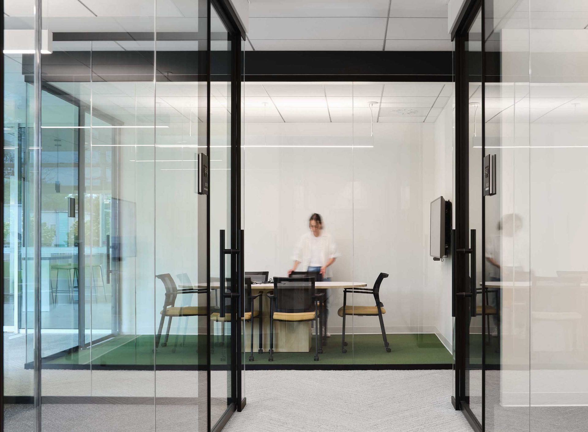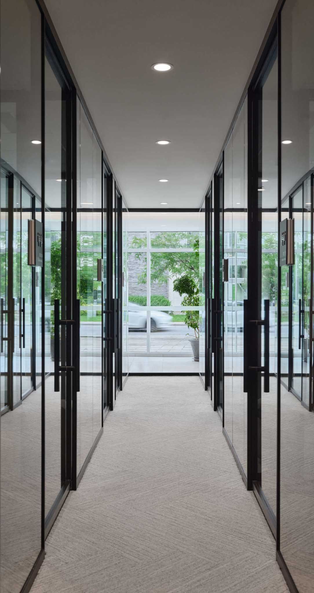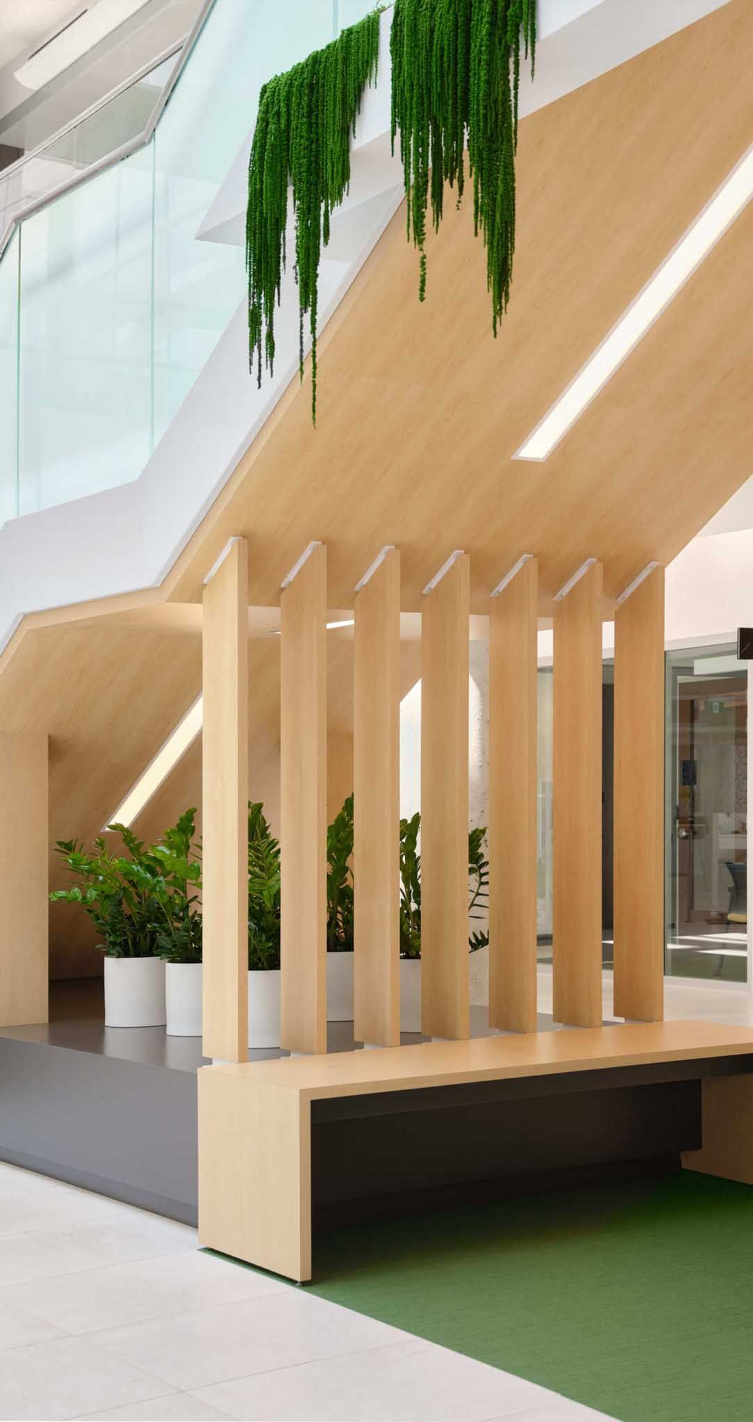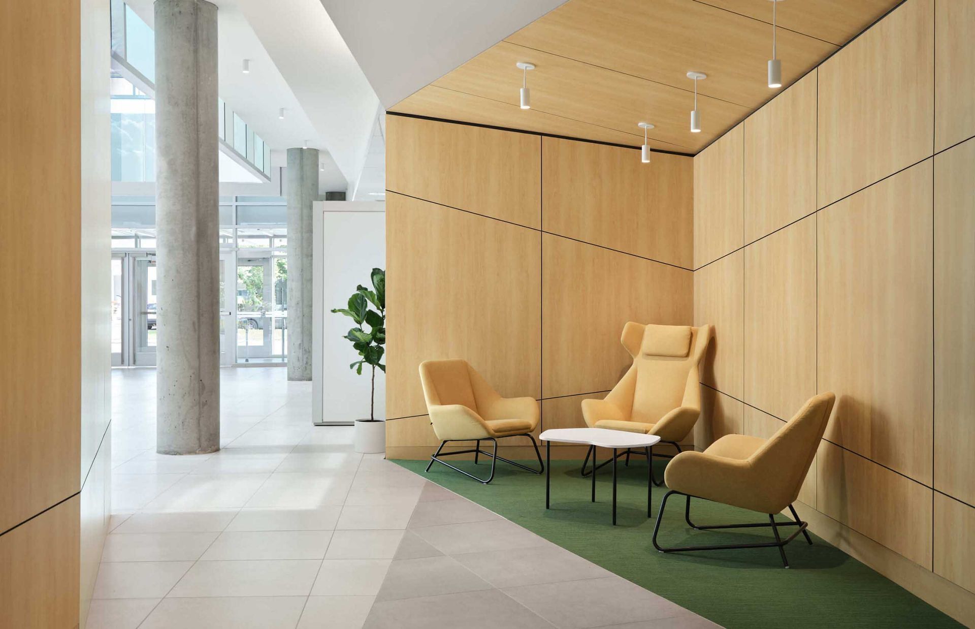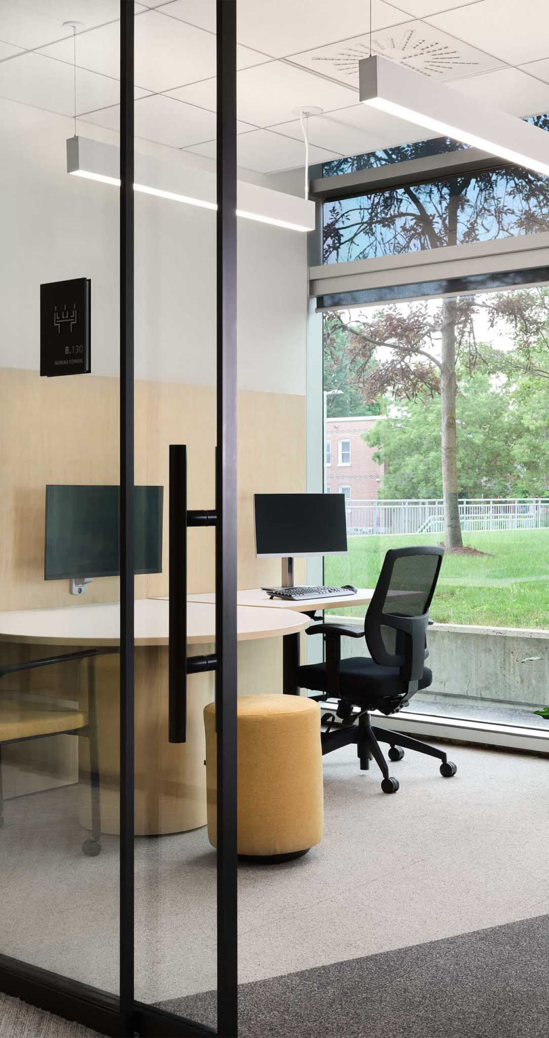 Integrating nature into the heart of the building. It was with this biophilic design approach in mind that the architects conceived the redevelopment of the ground floor of the Carrefour de la Coopération in Granby. The goal was to add a digital banking area to the space and make it more welcoming, functional, and user-friendly.