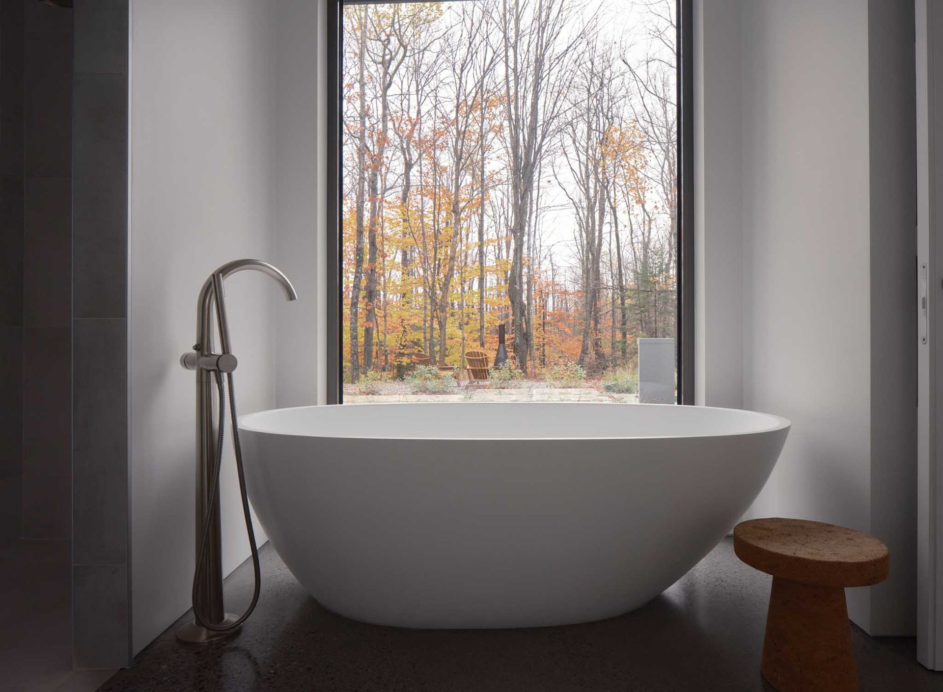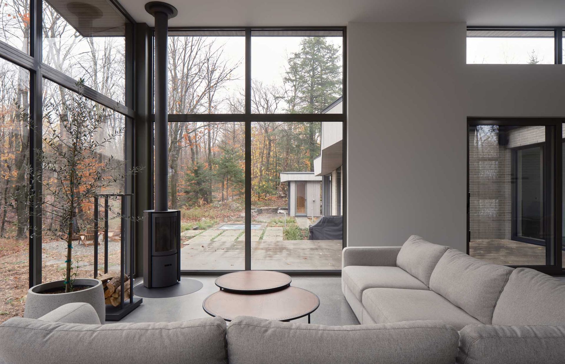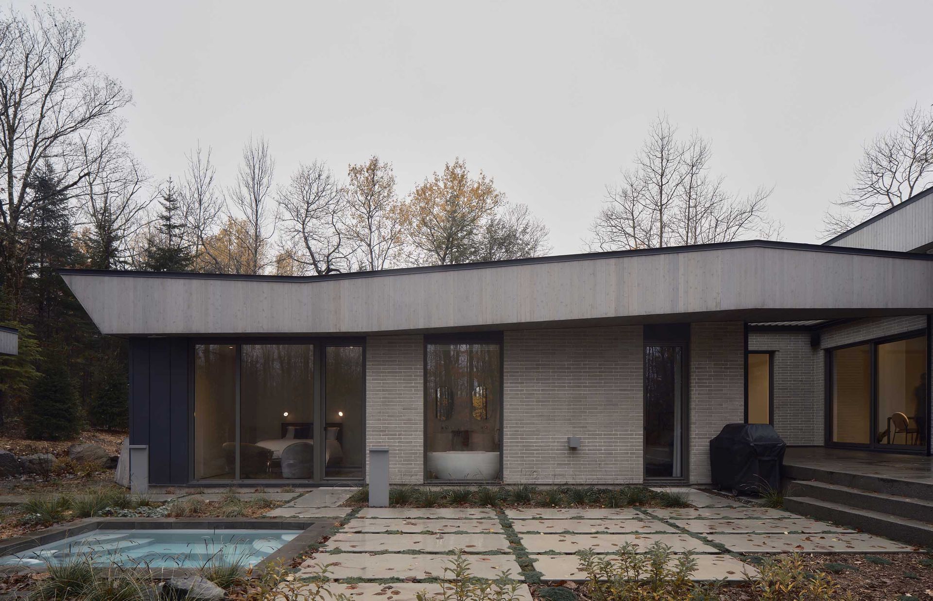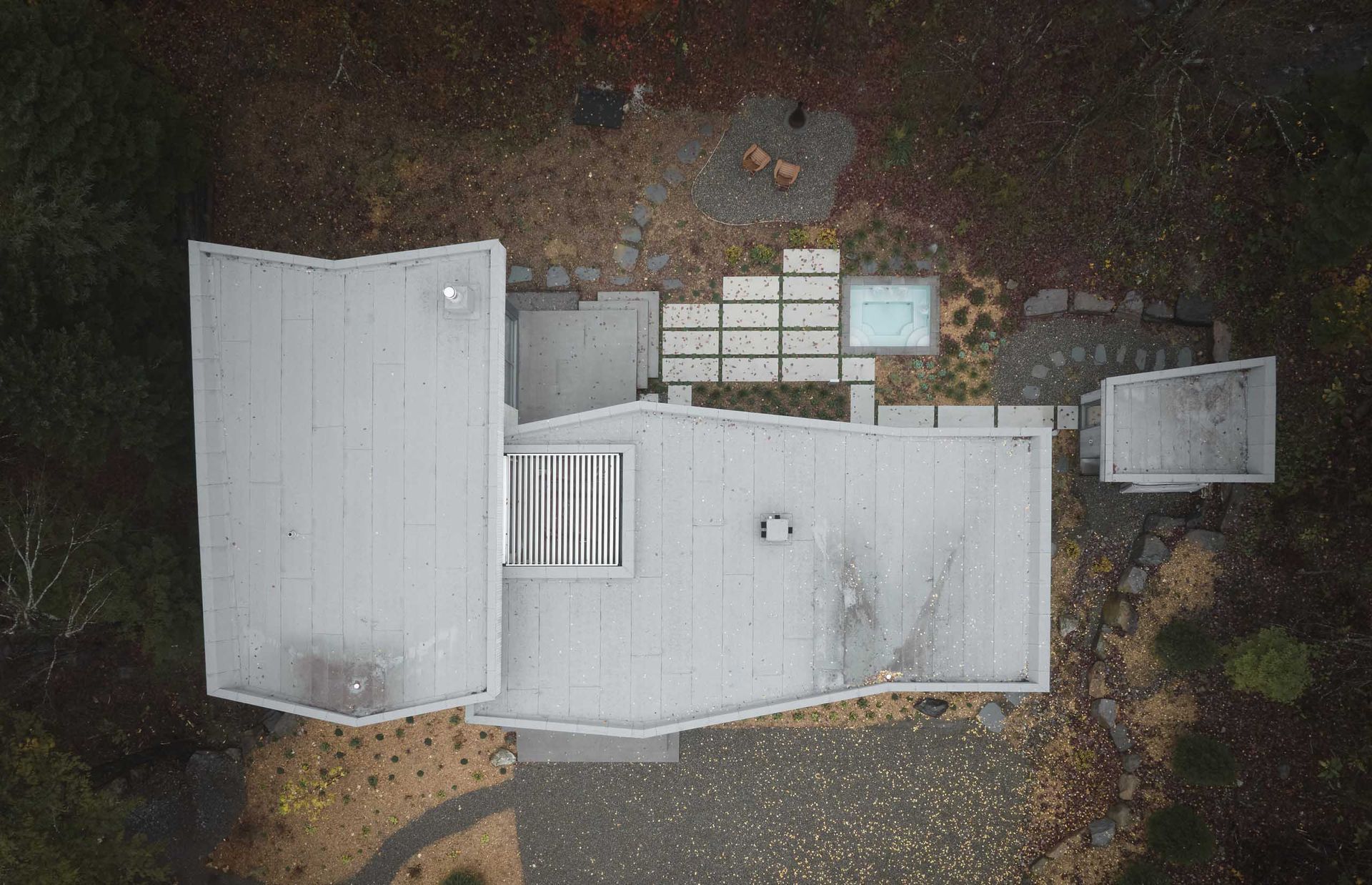 Bathed in morning light, the sinuous roofs and omnipresent glass accentuate the long facade. The terrace, protected from the wind by the living room extension, stretches to connect the sauna to the hot tub, the lower gallery to the upper gallery. Native plants grow alongside grass, creating a wild and unstructured effect. It is a small spa in nature, exactly as the owners requested, and the peaceful and healing effects are felt from the outset.