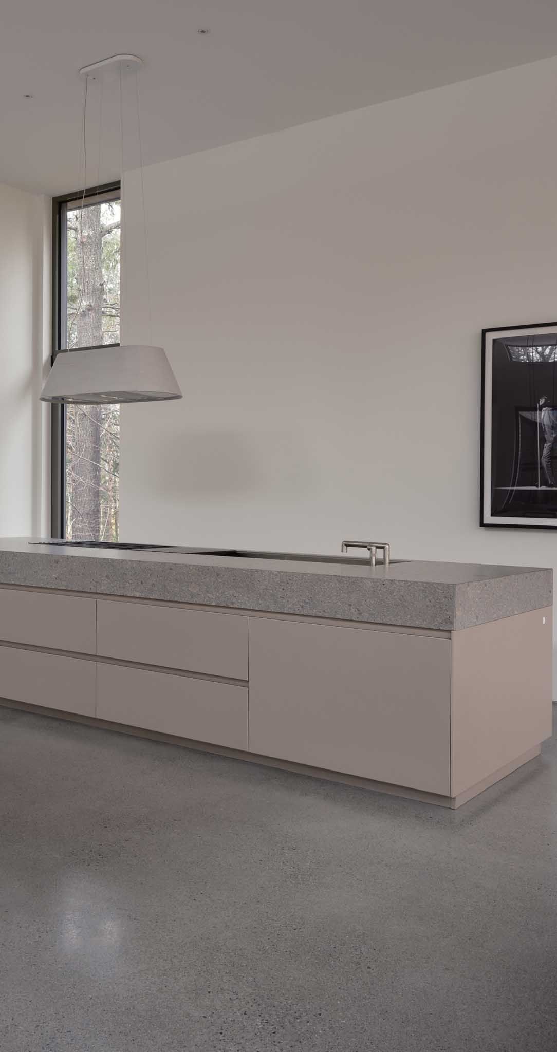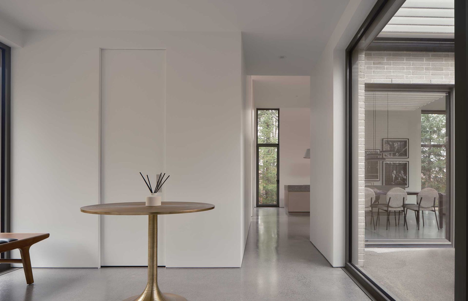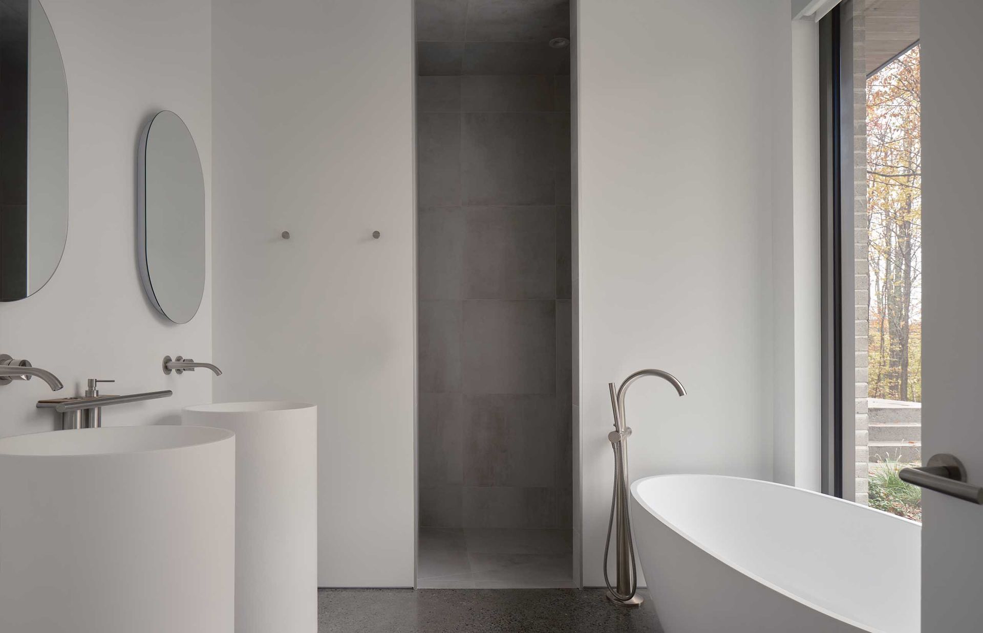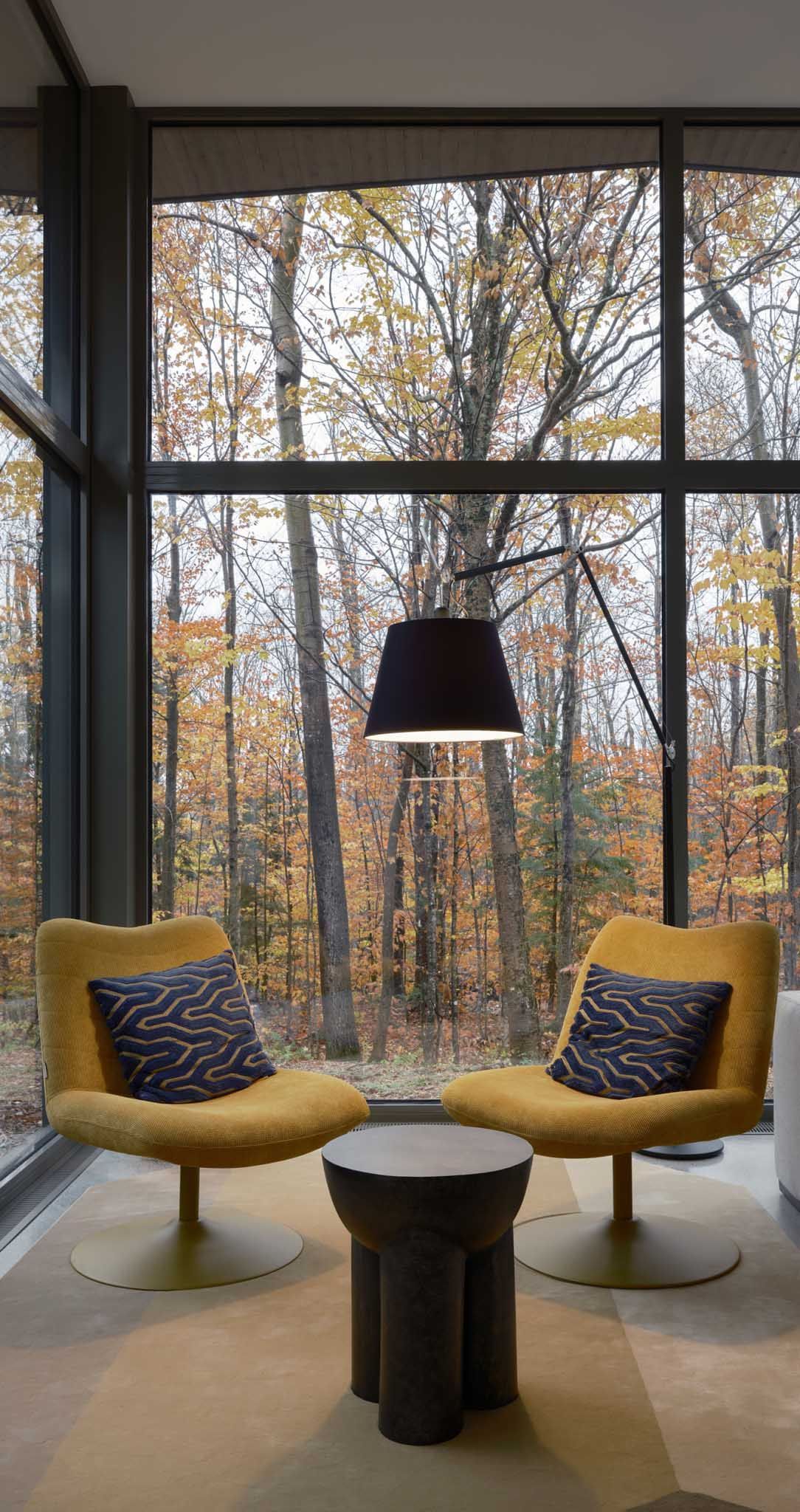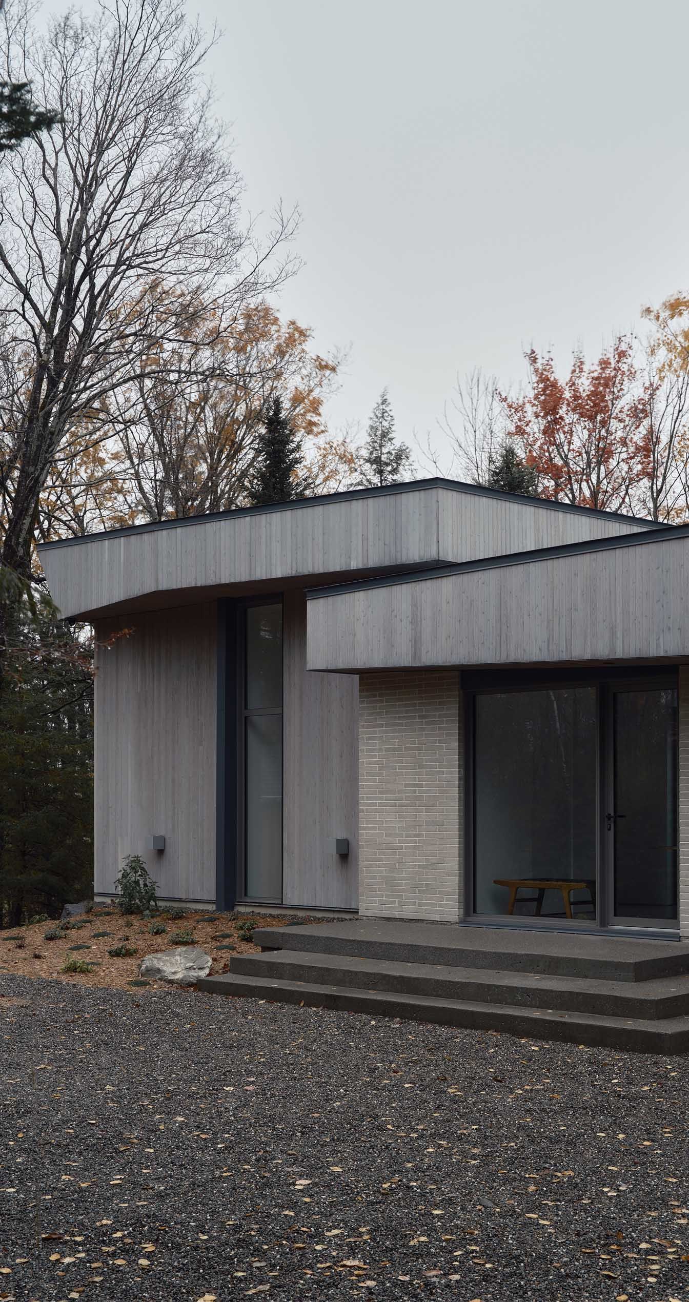 Bathed in morning light, the sinuous roofs and omnipresent glass accentuate the long facade. The terrace, protected from the wind by the living room extension, stretches to connect the sauna to the hot tub, the lower gallery to the upper gallery. Native plants grow alongside grass, creating a wild and unstructured effect. It is a small spa in nature, exactly as the owners requested, and the peaceful and healing effects are felt from the outset.