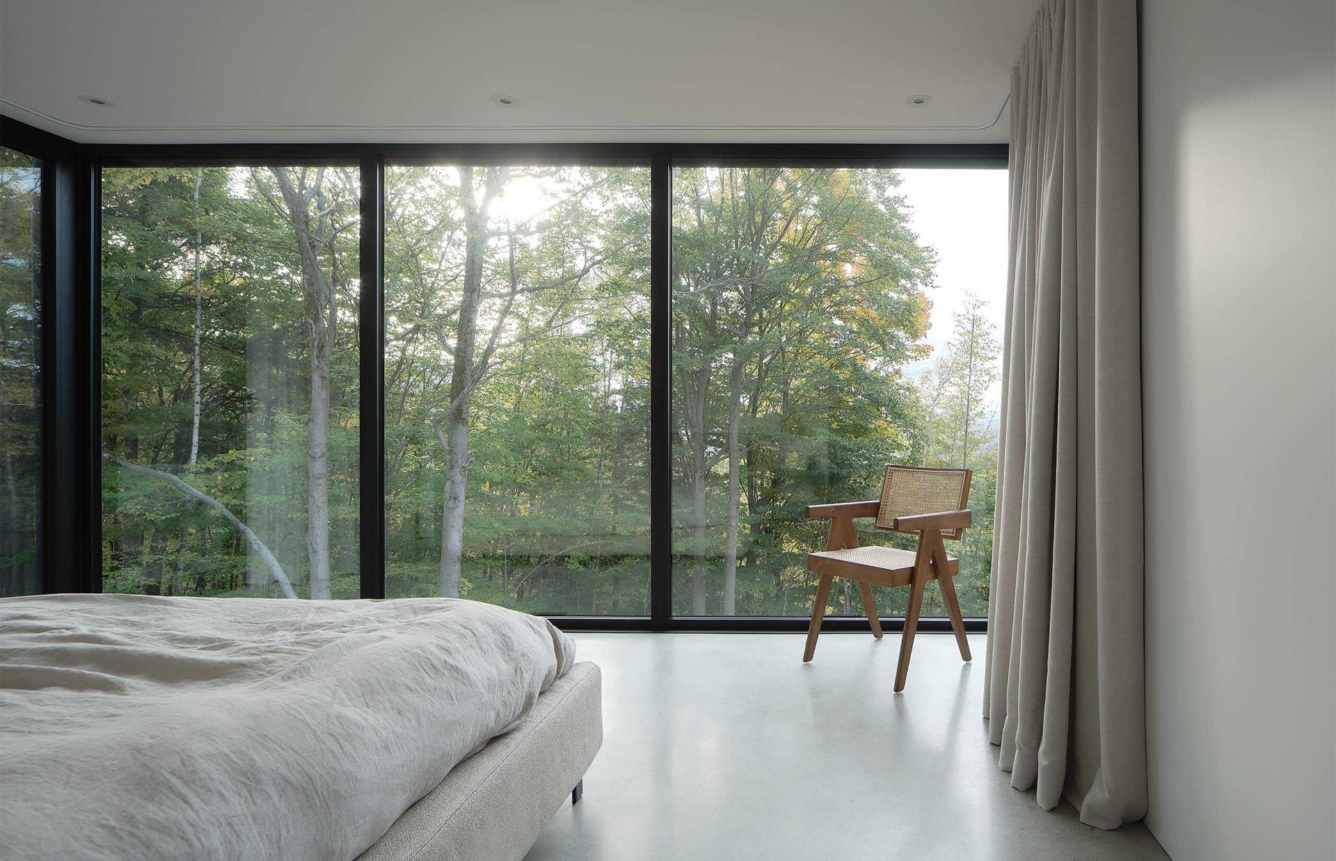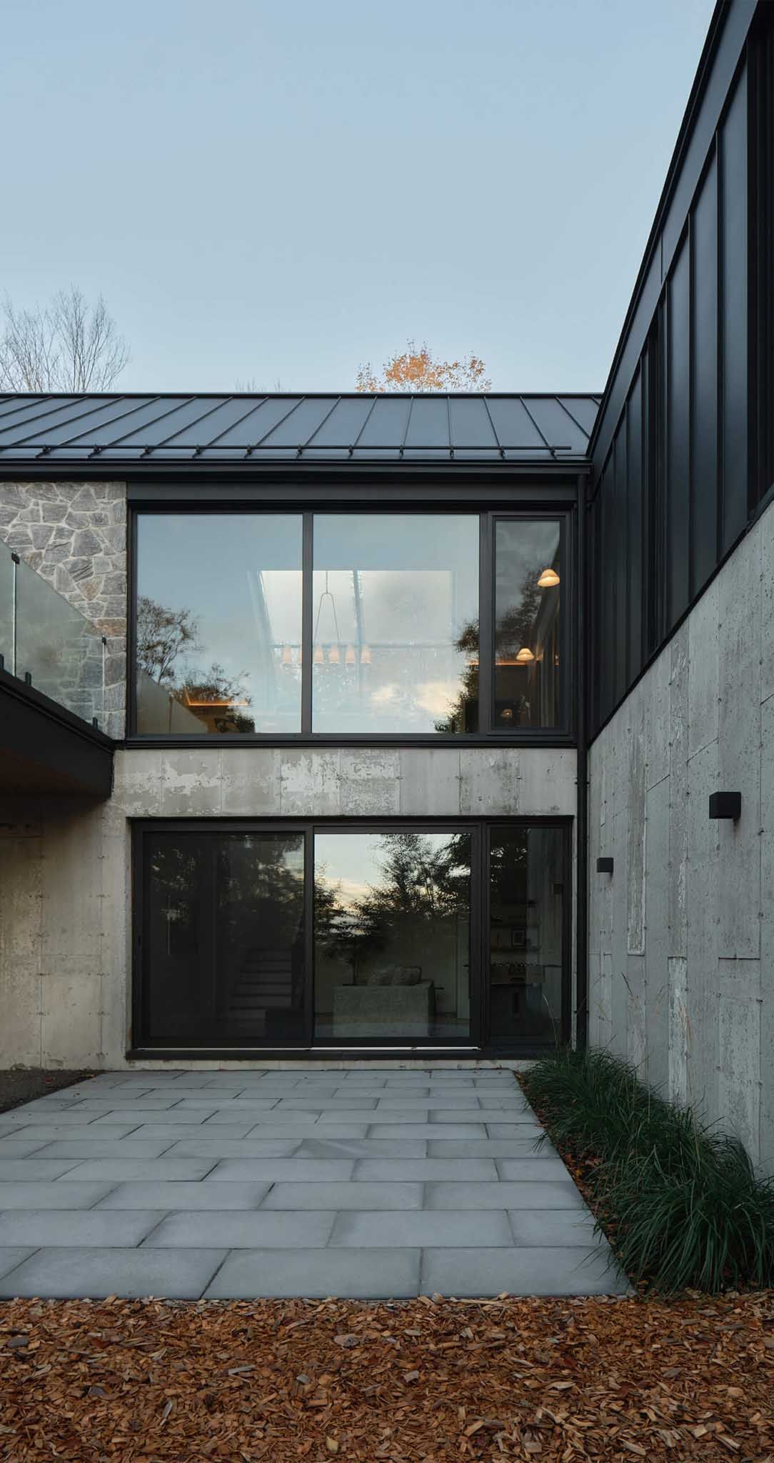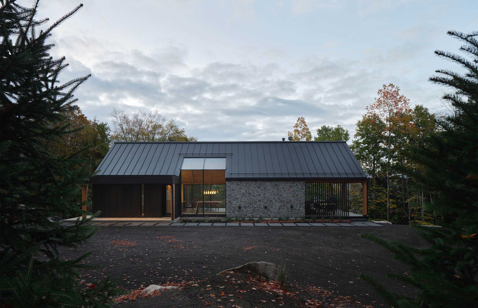 The dark and sober house rests delicately on a plateau, while advancing the wing of the bedrooms towards the south, following the relief. A transparent glass opening marks the entrance, catches the eye, and offers a view of the deep green of the forest through the house. On one side, black metal cladding extends the roof; on the other, natural stone. And the slats, openwork, light, border the terrace at the far end.