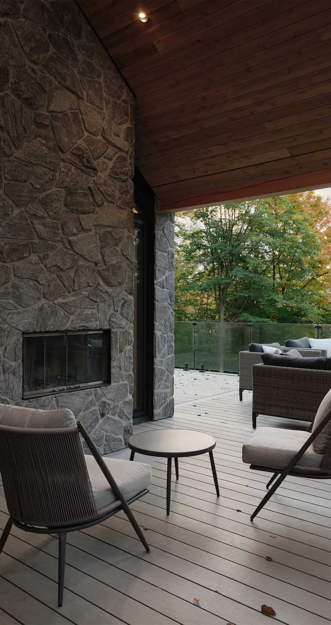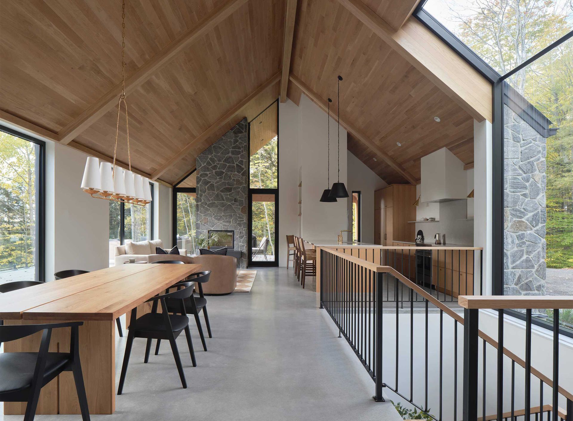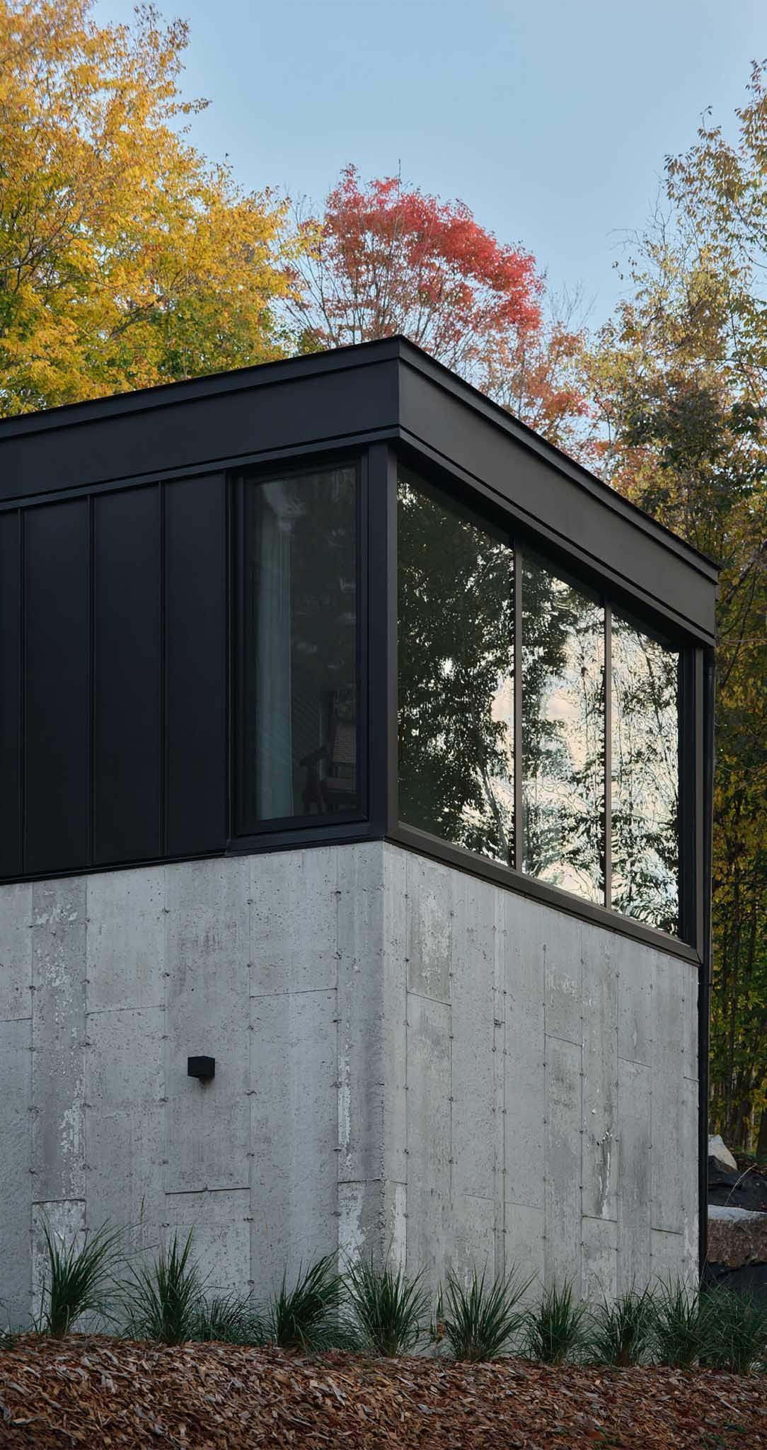The dark and sober house rests delicately on a plateau, while advancing the wing of the bedrooms towards the south, following the relief. A transparent glass opening marks the entrance, catches the eye, and offers a view of the deep green of the forest through the house. On one side, black metal cladding extends the roof; on the other, natural stone. And the slats, openwork, light, border the terrace at the far end.
