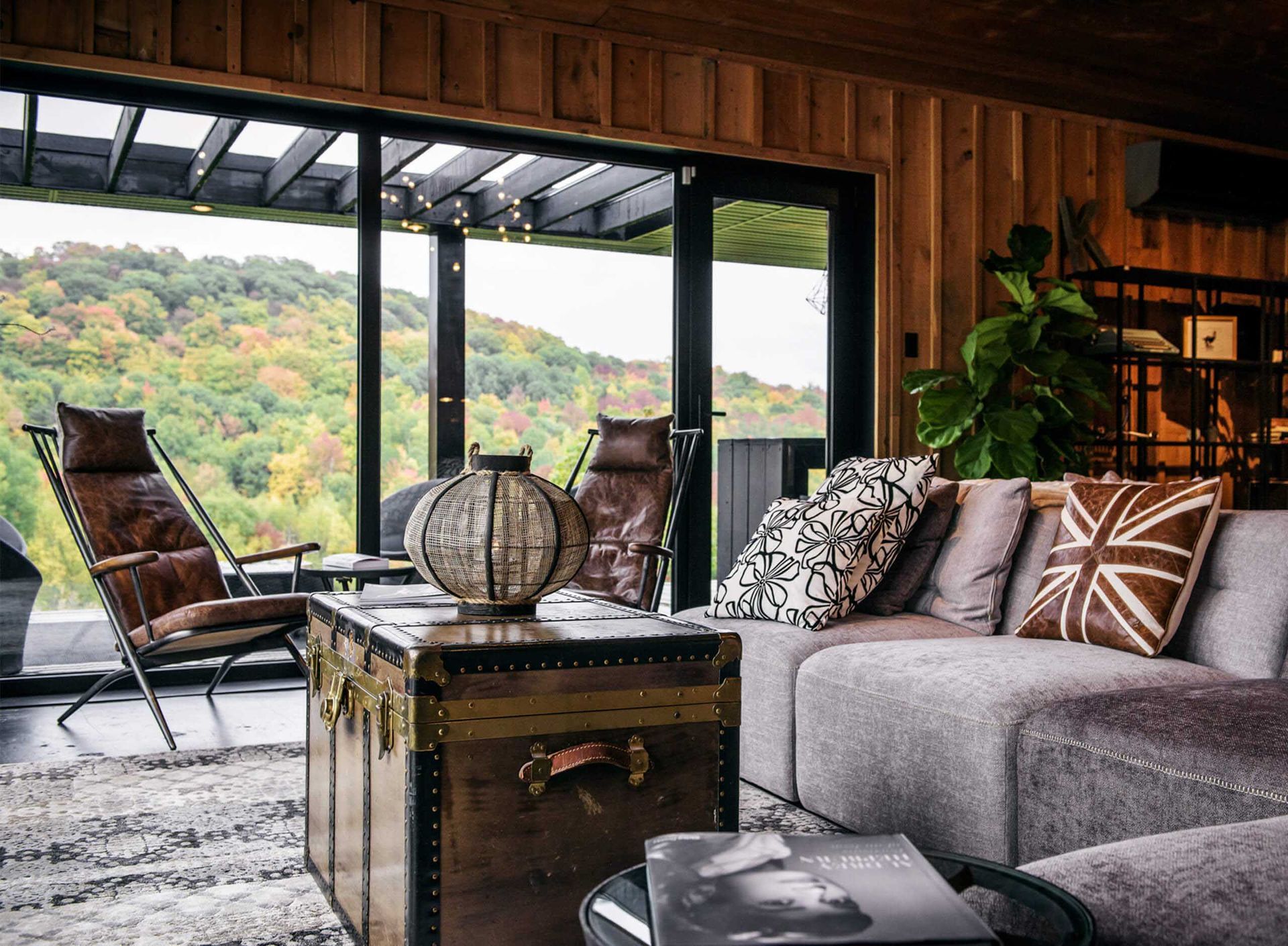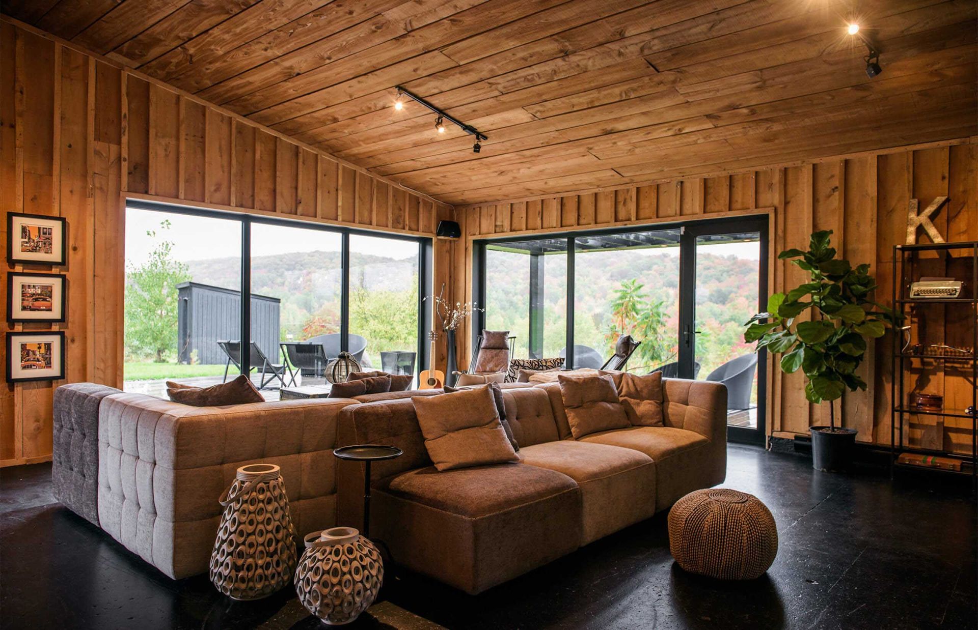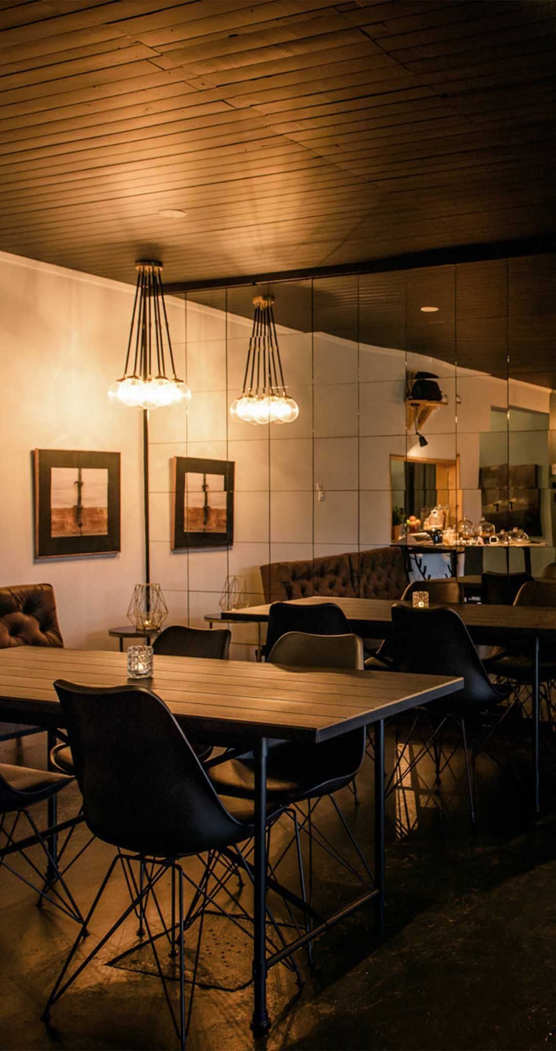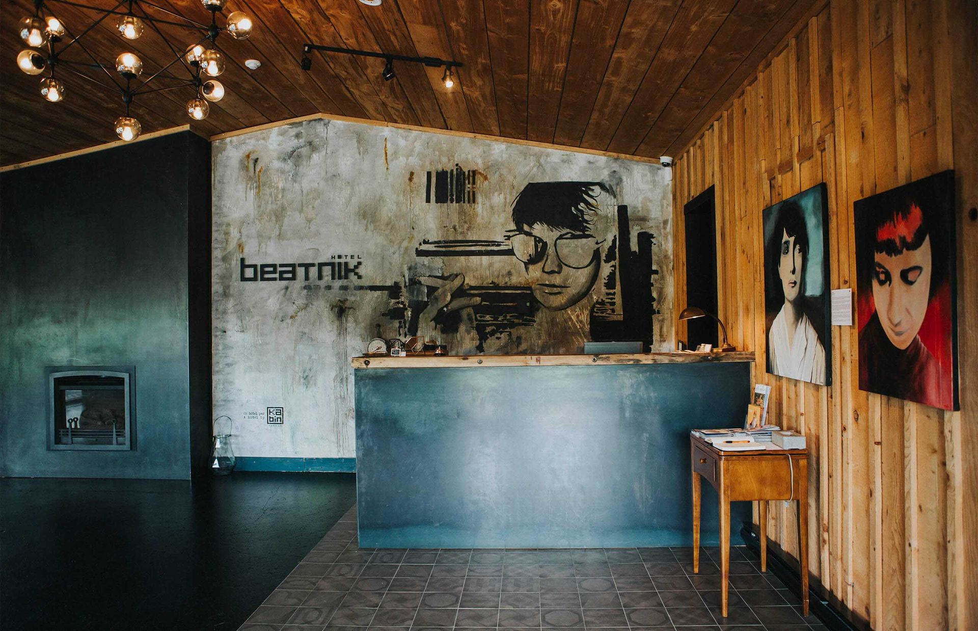 En entrant, la zone d’accueil surprend avec une grande murale rustique aux accents urbains qui crée une ambiance décontractée. Un foyer est installé au centre de la pièce, invitant à l’apéro de l’après-ski. Plusieurs matériaux sont originaux ou récupérés, telle cette porte de box d’écurie qui sépare la réception du bistro, tel ce mur de miroirs antiques au fini abîmé… À l’est, dans un mur du bistro, une grande fenestration a été prévue pour offrir vue sur le lever du soleil.