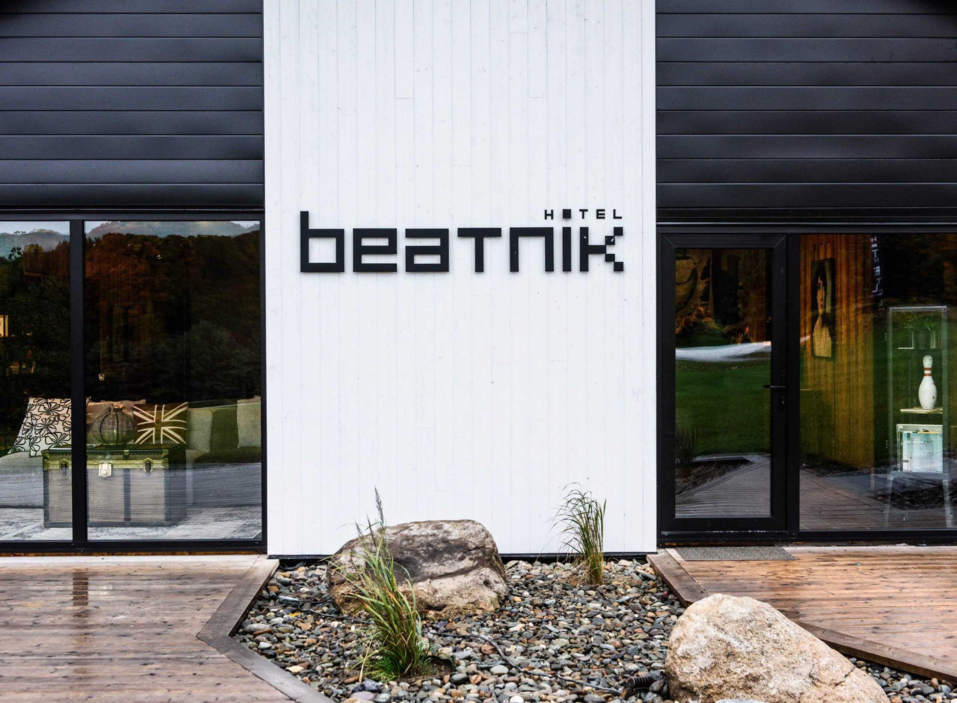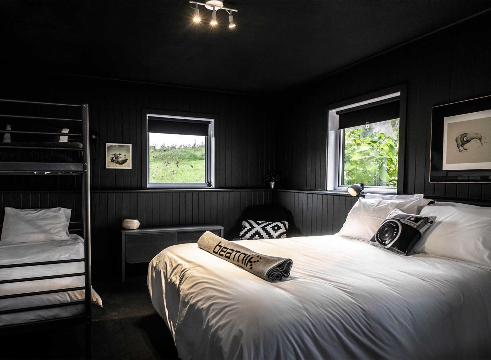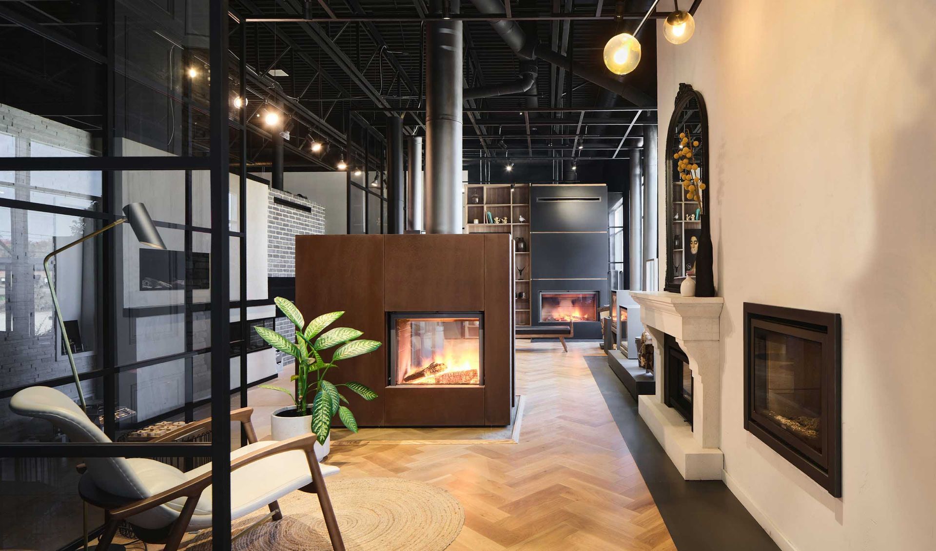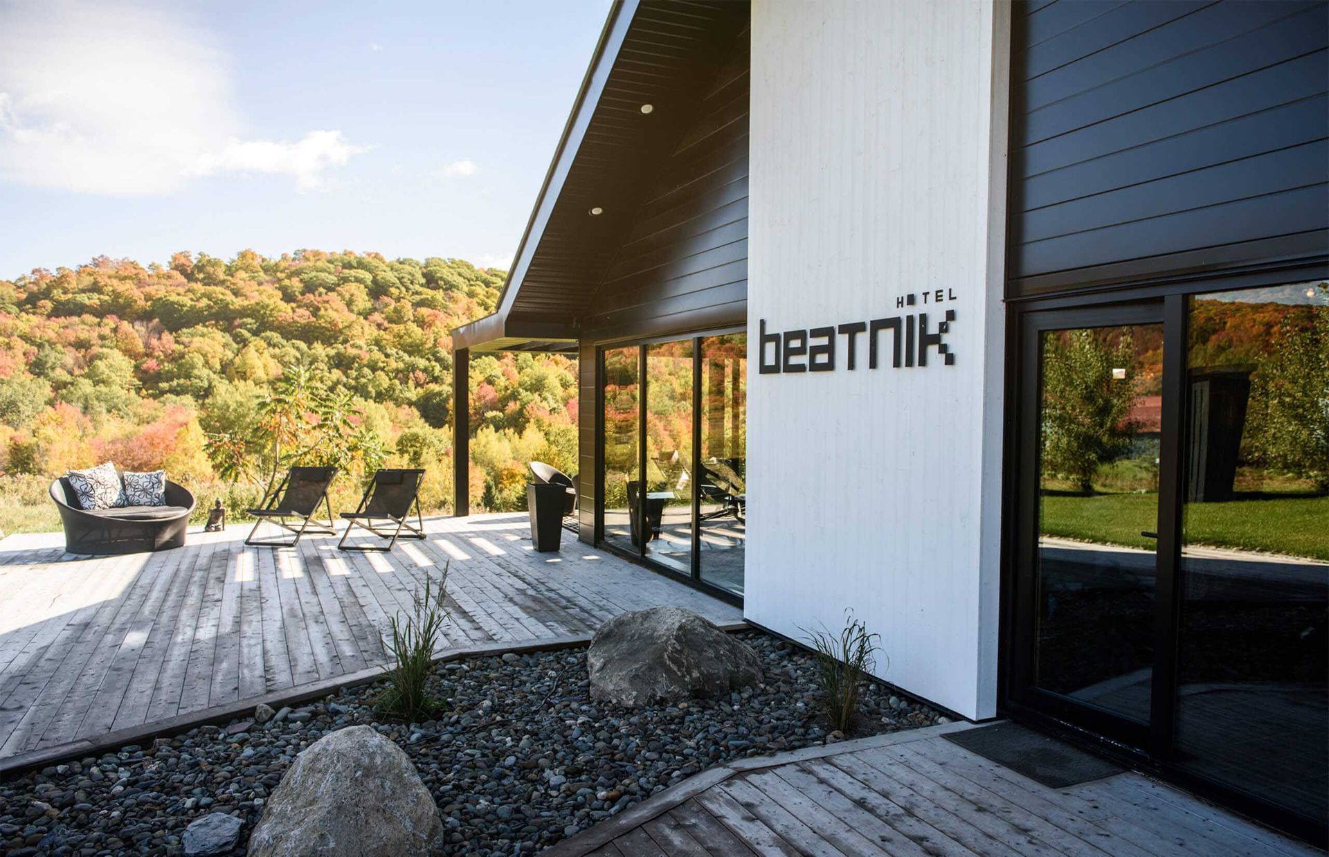 En entrant, la zone d’accueil surprend avec une grande murale rustique aux accents urbains qui crée une ambiance décontractée. Un foyer est installé au centre de la pièce, invitant à l’apéro de l’après-ski. Plusieurs matériaux sont originaux ou récupérés, telle cette porte de box d’écurie qui sépare la réception du bistro, tel ce mur de miroirs antiques au fini abîmé… À l’est, dans un mur du bistro, une grande fenestration a été prévue pour offrir vue sur le lever du soleil.
