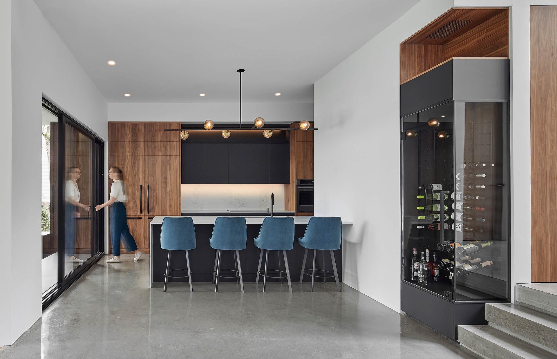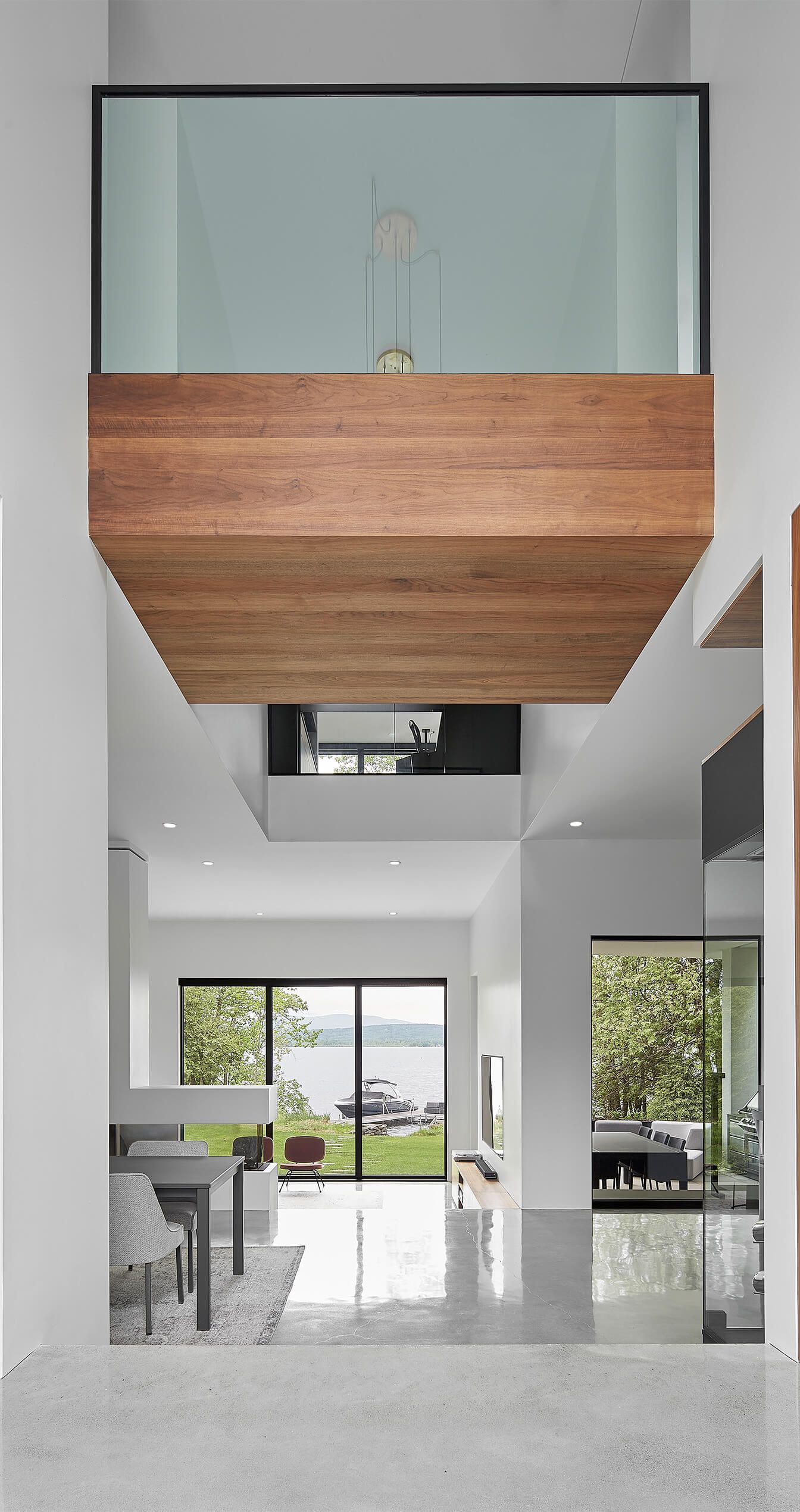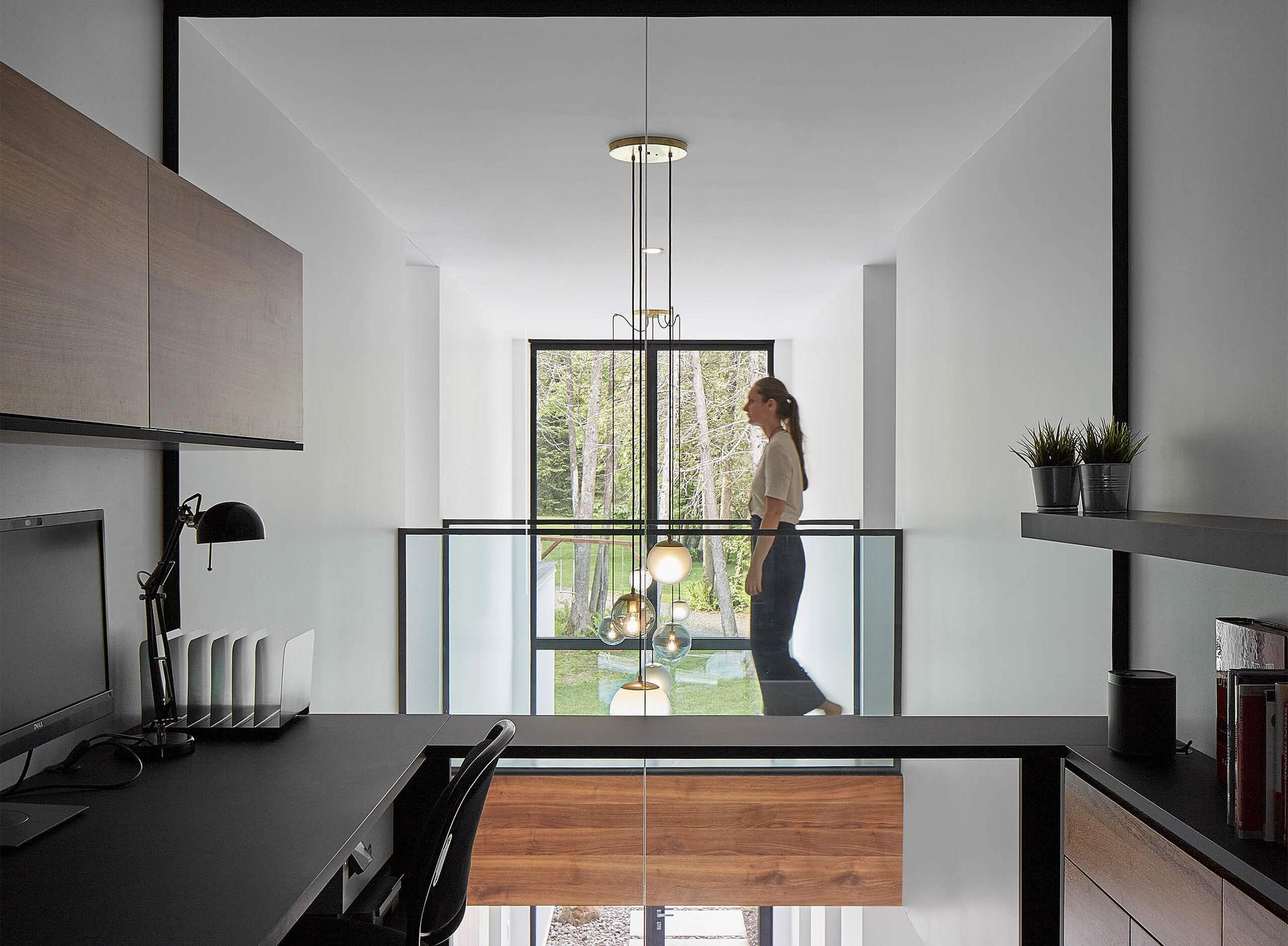 À l’étage, au cœur de la maison, on découvre un bureau aux parois vitrées qui offre une vue spectaculaire sur le lac, et permet d’admirer la passerelle qui flotte doucement au-dessus de l’entrée.