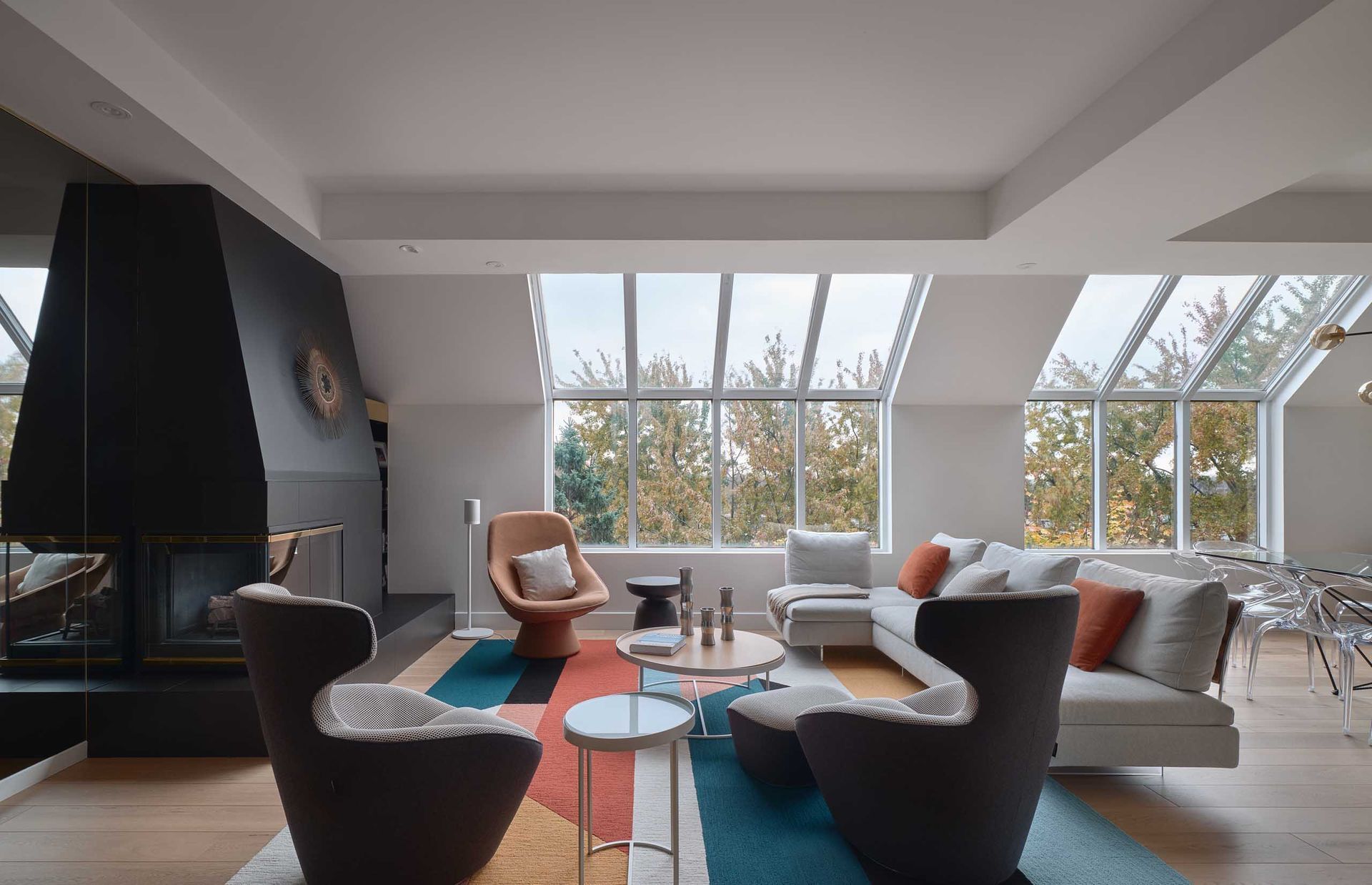Le côté sud de la résidence, entièrement vitré, et les terrasses meublées sur deux étages invitent la nature dans les espaces de vie. En ces endroits, l’intérieur et l’extérieur se côtoient ; ils s’unissent pour ne faire qu’un.
